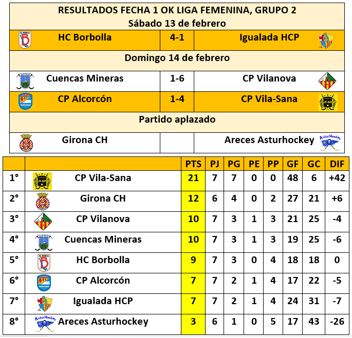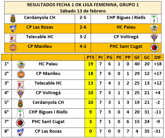 En el primer grupo, el HC Palau se afirmó en el liderato al sumar los tres positivos en su visita a Madrid para superar al CP Las Rozas; mientras que su inmediato escolta, el Manlleu, dio cuenta como anfitrión ante otro catalán, el Sant Cugat.
