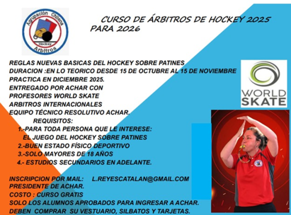 Mientras el referí Claudio Bórquez cumple buena labor en el Mundial de Clubes en San Juan, al otro lado de la cordillera la Asociación Chilena de Árbitros de Hockey convoca a un curso de jueces para quienes quieran formar parte del cuerpo arbitral.