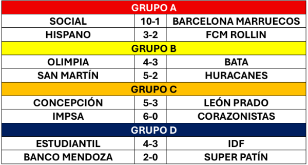 Catalanes. Barcelona Marruecos cayó 10-1 con Social San Juan, con la formación de Yair Garrido; Sebastián Aravena, Bastián Guerra; Julián Mateo y Valentín Alarcón, agregando a Mateo Moncada (1 gol), Mathias Villalobos, Vicente Araya, Benjamín Figueroa y Bruno Cifuentes (AS).
