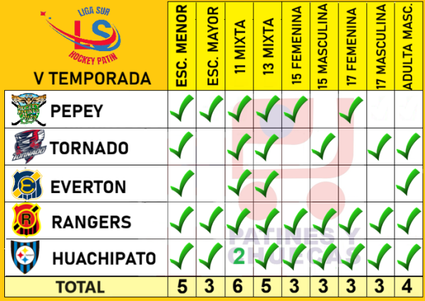Quinteto. Para esta temporada serán cinco los clubes que competirán por los cetros de Liga Sur. A saber, Pepey de Rancagua, Rangers de Talca, Tornado de Chillán, Huachipato de Talcahuano y Everton de Viña del Mar.