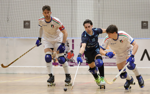 Argentina, con doblete de Danilo Rampulla -en la foto, ante dos rivales italianos-, revalidó su corona en la Copa de las Naciones en Montreux. (crédito foto: Gordon Morrison)